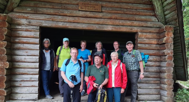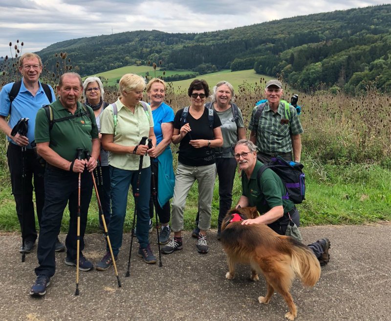 Nach der Querung der Landstraße von Talheim nach Öfingen ging es nun ständig bergauf. Zunächst noch auf breiten Waldwegen, später dann auf einem schönen Pfad durch den Mischwald und kurze Zeit später stehen wir auch schon auf dem Gipfel des Himmelbergs. Vor uns lag in der Ferne der Hochschwarzwald, die Baar und irgendwo dazwischen in den Tälern die Wutachschlucht. Nach einer verdienten Pause in der Schutzhütte und dem Eintrag in das Gipfelbuch begann der Abstieg. Am Waldrand angekommen bot sich ein herrlicher Blick ins Ippinger Tal. Über breite Feldwege und entlang des Baumlehrpfades ging es wieder zurück zum Ausgangspunkt. Den schönen Spätsommertag ließen die Wanderer bei gutem Essen und netten Gesprächen im Gasthaus Adler in Wellendingen ausklingen.