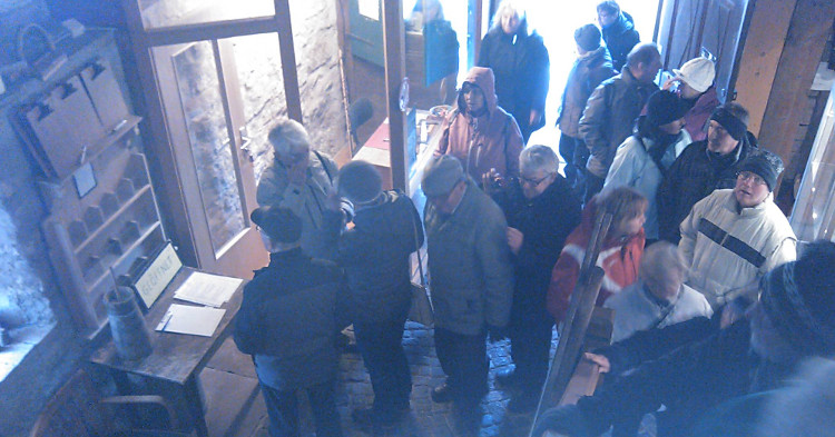 Nach einer kurzen jedoch sehr schönen Wanderung entlang des Amonitenwanderweges wurden wir in Mühlhausen von dem ehemaligen Lehrer Leibold empfangen. Er erklärte uns die Mühle des Ortes, in der sich noch einige Utensilien der Unteren Mühle von Wellendingen befinden. Weiter ging es nach einer Stärkung mit Kaffe und Hefezopf zum Bauernmuseum, zum alten Schulhaus, dem Göpel- und dem Backhaus. Überall konnte uns Leibold viel Interessantes über die Häuser und deren Inhalt erläutern.